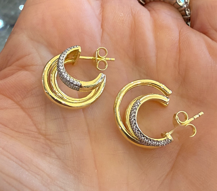 The perfect day to night earrrings! The Eliza earring looks like a triple huggie all in one! Featuring one pave hoop and two gold