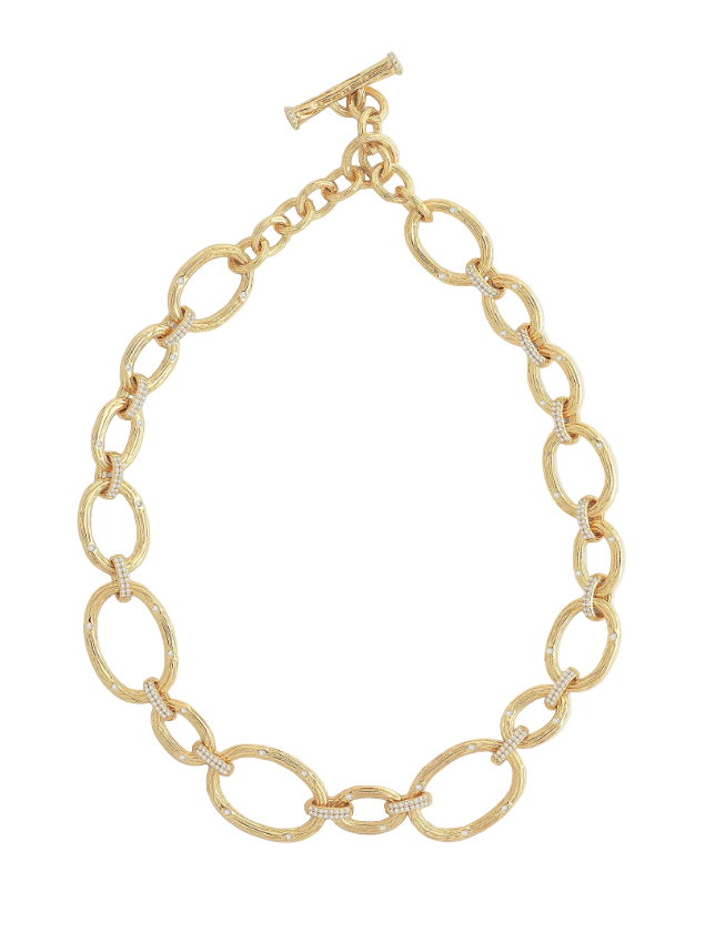 Crafted from 18k gold dipped brass castings which are punctuated and banded with hundreds of hand set crystals
