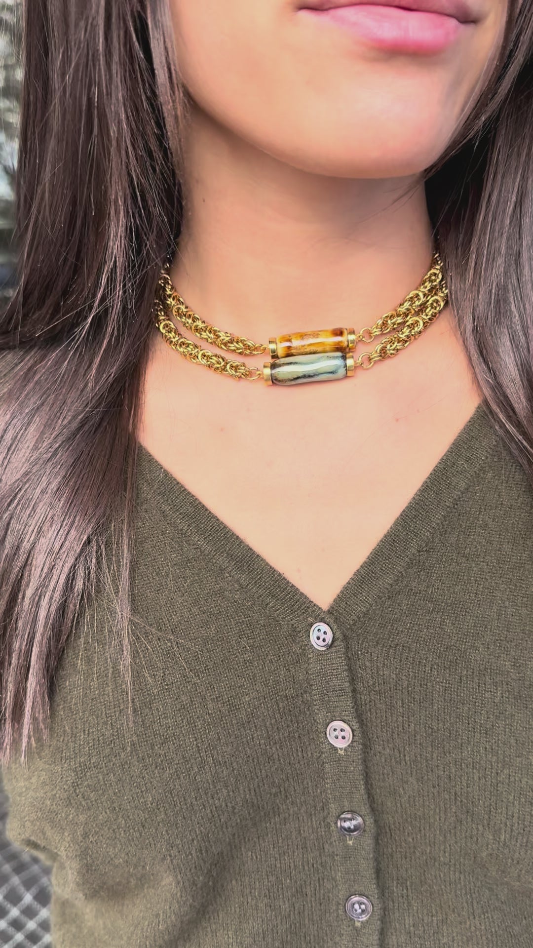 • 22 K gold plated chain with hand made porcelain stone in the center.