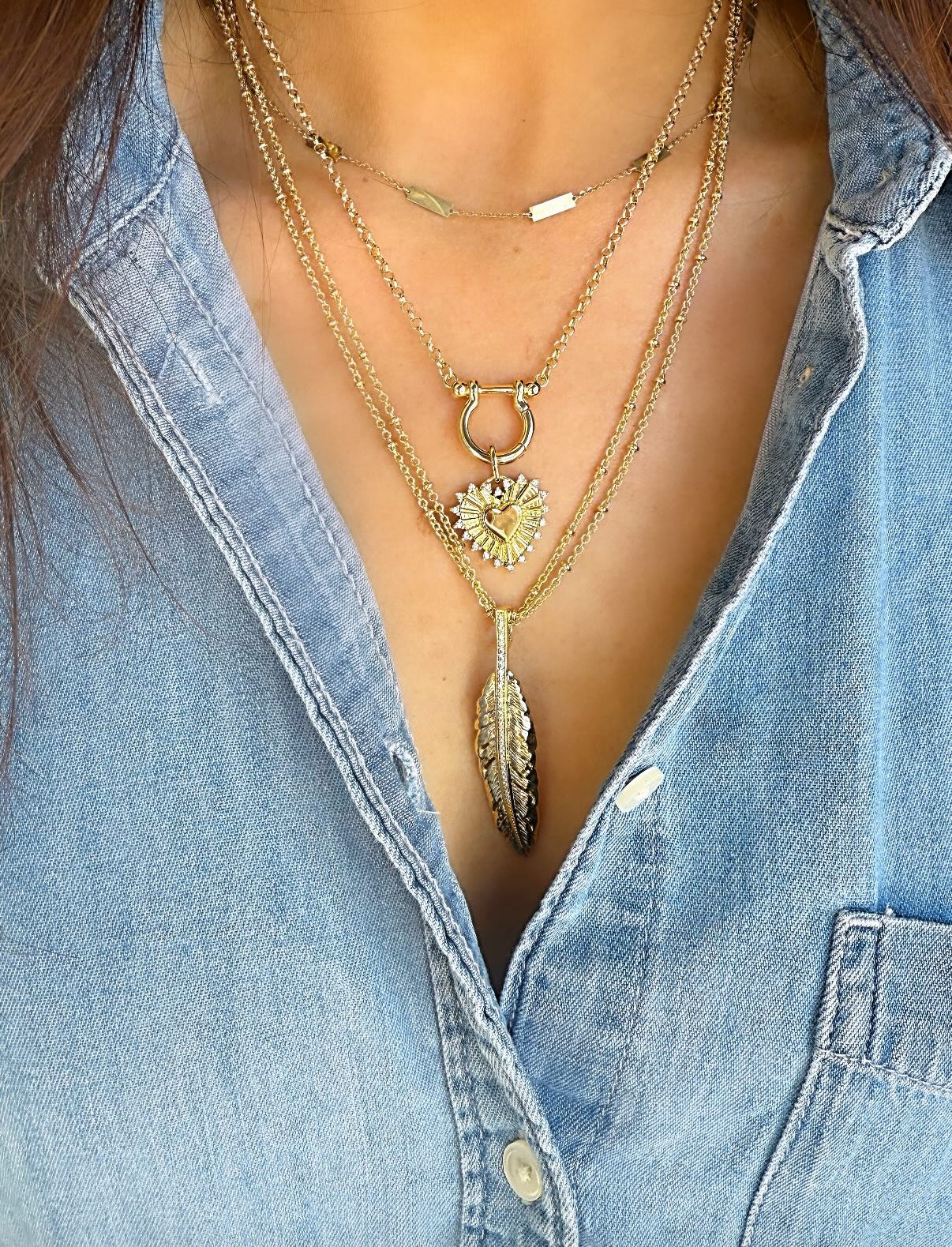 This necklace features a removable gold feather pendant with our signature gold molten bead chain necklace